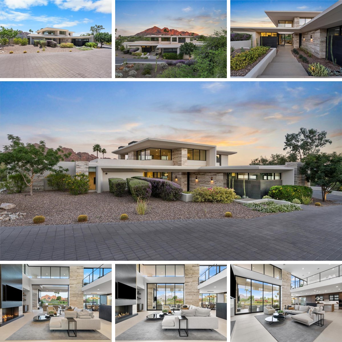 This award-winning architectural 5 bdrm masterpiece by CP Drewett and Bedrock Developers is a study in elegance and innovation, described by Drewett as a 'never-ending ribbon that wraps and folds'. The Italian Snaidero kitchen, a $500k showpiece, features Taj Mahal Quartzite countertops, illuminated cabinetry + a striking glass wine wall. The primary suite offers a spa-inspired bath. Black basalt + veined Tuscany stone wrap walls both inside + out, merging its exterior + interior spaces effortlessly. Floor-to-ceiling glass walls offer sweeping views of Camelback Mtn + Mummy Mtn. Outdoors, the home is built for relaxation and entertainment - large custom couches surround a central fireplace with tv, and border a sleek pool, spa, outdoor kitchen, and BBQ, all set against an expansive, elegantly designed patio. Every detail in the home is meticulously curated, from Minotti and Flexform furnishings to a Crestron smart home system. Recognized globally, this home won the 2021 Gold Nugget Award of Merit for Best Custom Home (4,000-6,000 sq. ft.)